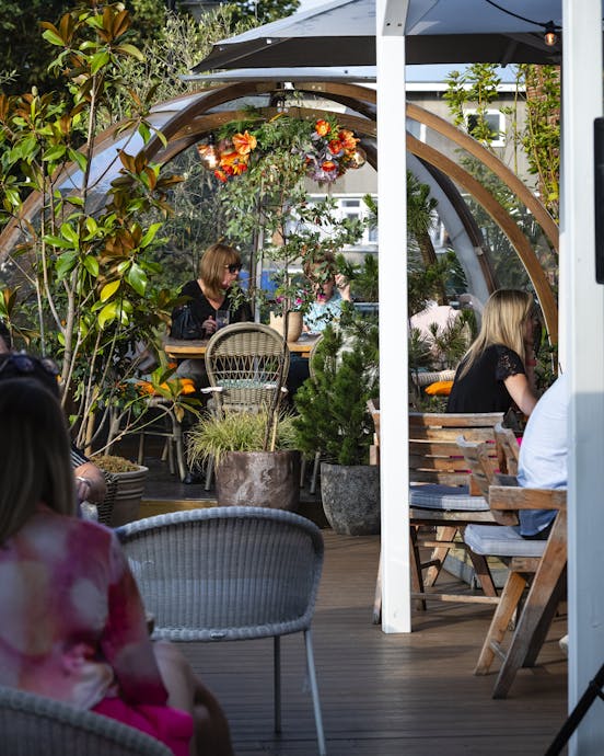 Hidden above Cobham high street with three private dining igloos, our terrace is sunny by day and fairylit at night.